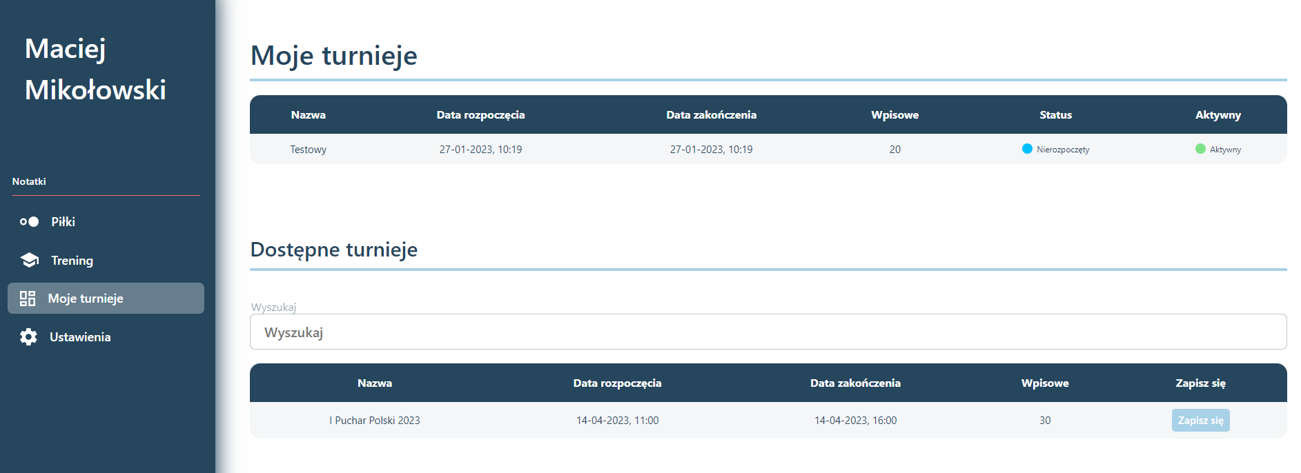 W niniejszym artykule natomiast interesować nas będzie zakładka Moje turnieje dostępna w bocznym menu wyglądając następująco